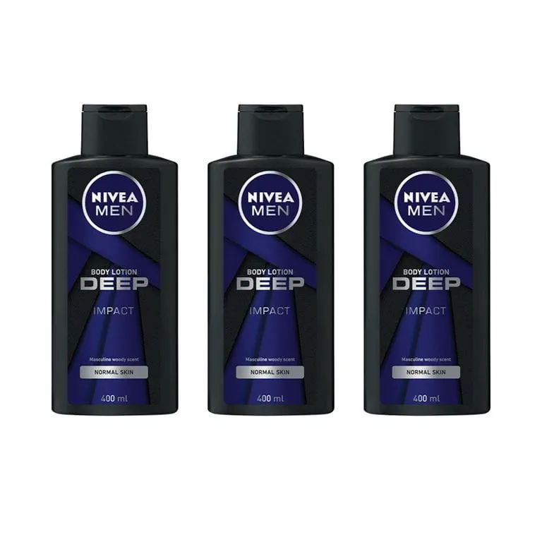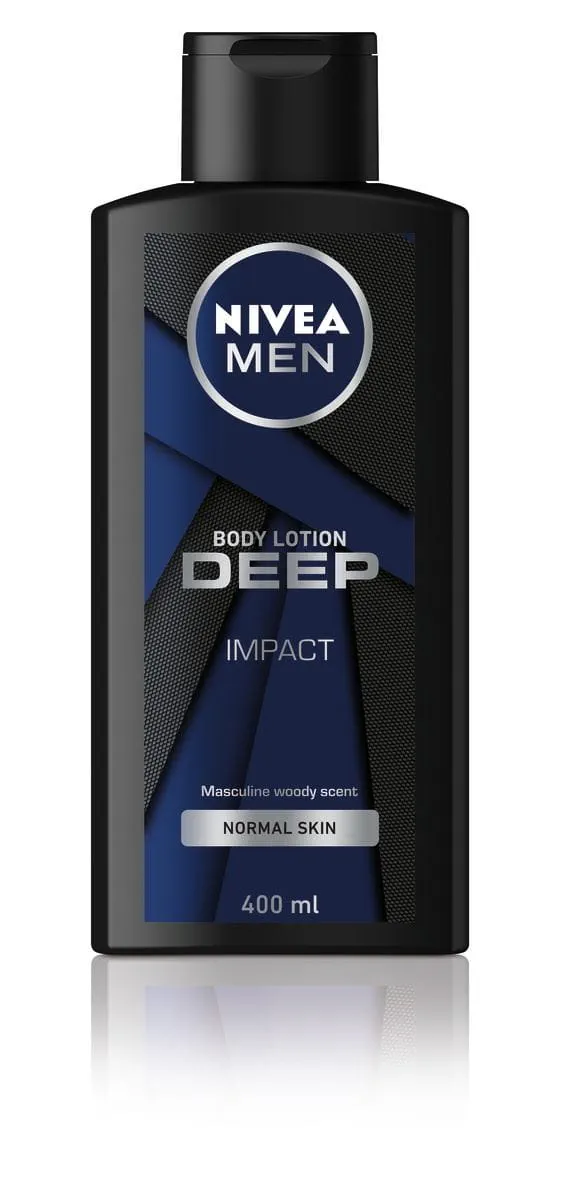 NIVEA Men Deep Impact Body Cream 400ml intensely moisturises skin for 48 hours, and leaves it feeling fresh thanks to black carbon. Woody and spicy notes give skin a distinctly masculine scent.