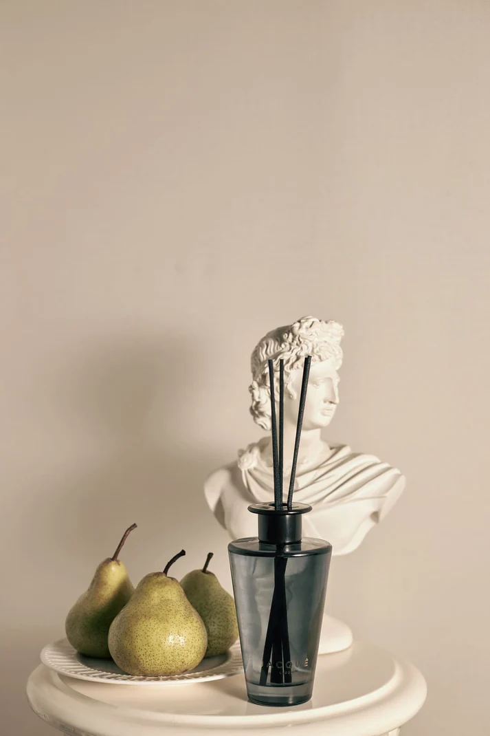 Fill the air with the sensuous freshness of just-ripe pears, wrapped in a bouquet of white freesias, and mellowed by amber, patchouli and woods.