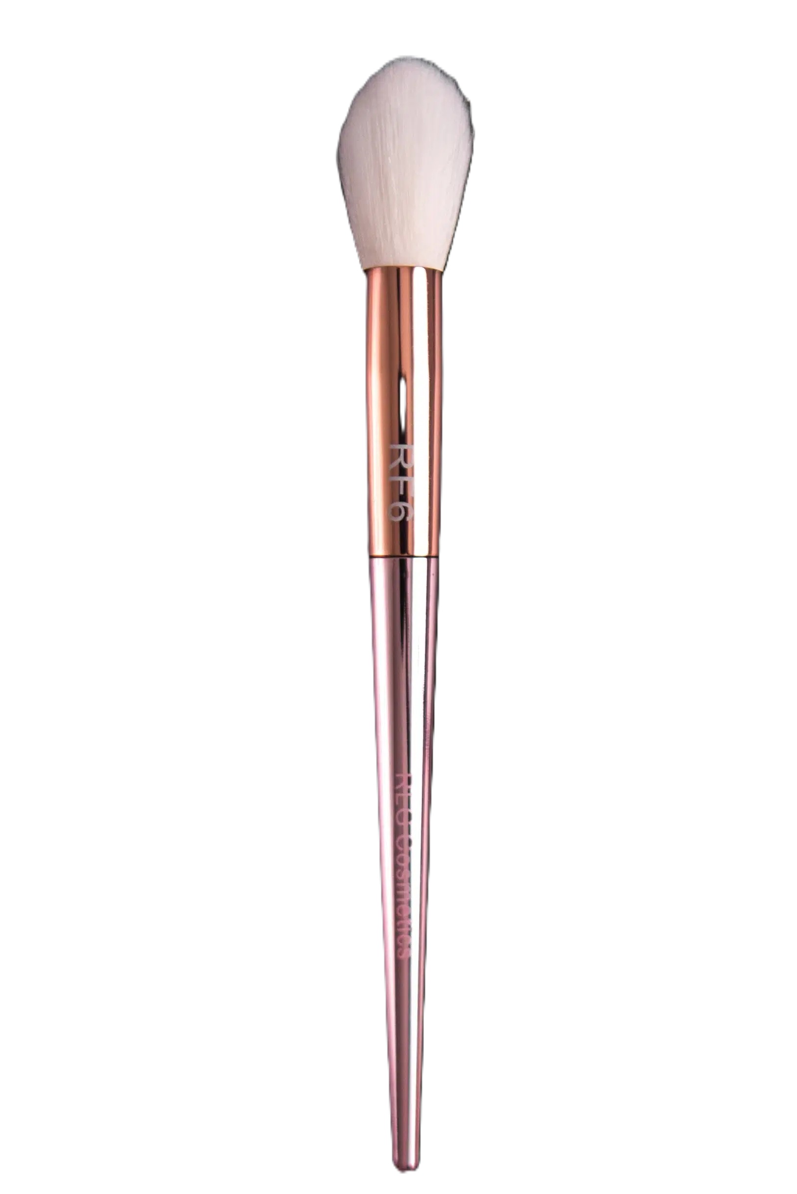 RF6, a fluffy highlighter brush…..this brush blends out your highlighter without leaving any harsh lines, the shape was curated so you could apply the highlighter with the brush layed flat and blend out the highlighter with tip! No more harsh lines of highlighter just sitting on the face!